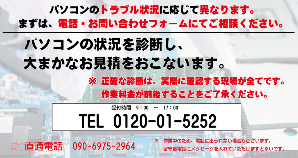 ’’お電話’’いただきますか’’お問い合わせのページ’’より下記をご連絡ください。【症状、お名前、ご住所、ご希望の訪問日時】